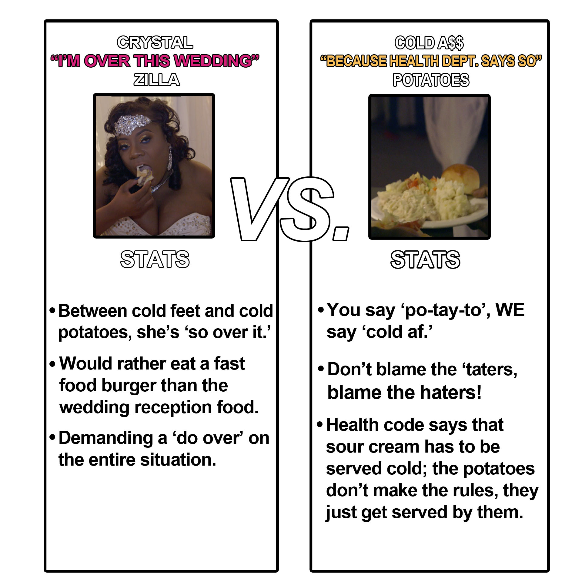 When Rashon is caught texting his ex, the truth comes out about Crystal and a “slip up” she had with one of her baby daddies behind Rashon’s back. The tension causes Crystal to catch a case of cold feet, but not cold enough to keep her from trotting down the aisle. But, Rashon and his ex aren’t this Bridezilla’s biggest battle...it’s the cold potatoes.